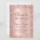 Célébrez en style avec cette Parties scintillant d'or Rose moderne "Cheers to 90 Years" Anniversaire Invitation. Ce design chic et féminin présente des détails chatoyants de parties scintillant d'or rose, un script gracieux de calligraphie de queue d'écharpe, et un arrière - plan doux rose pâle à l'allure de feuille métallique. Parfait pour une fête glamour du quatre-vingt-dixième anniversaire ou tout événement marquant, facilement personnalisable pour une célébration des 40ème, 50ème, 60ème, 70ème ou même 80ème anniversaire.