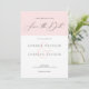 Élégante typographie moderne Enregistrer la date en noir avec un fond minimaliste rose et blanc.