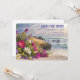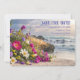 Beautiful flower son a coastal setting. A white sandy beach, with the rugged shoreline and ocean. A pretty save the date card.
