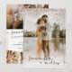 Mariage de script minimaliste moderne noir et blanc avec 5 photo collage grille avec cadre or rose et confetti en feuille.