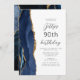 Le bord gauche de cette élégante invitation à la fête d'anniversaire moderne comporte une bordure en aquarelle bleu marine ornée d'une fausse parties scintillant dorée. Le texte personnalisable combine un script couleur or et des polices sans serif sur un arrière - plan blanc. L'envers est assorti d'un design d'agate bleu et or.