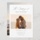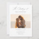 Capturez l'essence de votre histoire d'amour avec notre enseigne de photo moderne Script Elegant Beach Wedding. Parfait pour un mariage sur l'océan ou sur la plage, cette carte à double face présente une photo époustouflante d'un couple qui embrasse au coucher du soleil, incarnant l'élégance intemporelle d'une romance balnéaire. La calligraphie manuscrite en noir et blanc ajoute une touche de minimalisme moderne à ce design chic et tendance. Idéal pour les mariages d'été, informels mais élégants, cette invitation allie magnifiquement éléments contemporains et classiques, ce qui en fait un choix idéal pour une célébration côtière rêveuse.