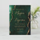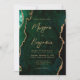 Cette élégante invitation de mariage présente une image arrière - plan d'agate d'aquarelle vert émeraude parée de parties scintillant en faux or. Le texte personnalisable combine écriture manuscrite moderne couleur or, cuivre et polices italiques. L'envers offre de l'espace pour les détails mariages sur un arrière - plan de course vert correspondant, ainsi qu'un code QR que les clients peuvent scanner pour visiter votre site Web et RSVP, ce qui permet d'économiser le coût d'impression et d'envoi de cartes RSVP séparées.