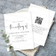 Script moderne QR Code Mariage noir et blanc ou changer à n'importe quelle couleur de votre choix. Le Mariage de est dans un script défini et personnalise facilement le reste du texte. Remplacez simplement l'exemple d'URL dans le champ modèle par votre propre URL et votre code QR sera automatiquement créé pour que vos invités puissent répondre en ligne.