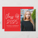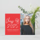 Invitations modernes de la fête de remise de diplômes mettant en vedette "Classe de 2023" dans une écriture manuscrite blanche sur un arrière - plan rouge. Personnalisez l'avant de l'invitation de diplôme en ajoutant le nom du diplômé, le nom de l'école et la photo verticale. L'invitation inverse pour afficher les détails de votre fête de remise de diplômes en lettres blanches sur un arrière - plan rouge.