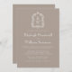 Cette élégante conception de faire-part de mariage d'inspiration vintage comprend une paire d'initiales en monogramme blanc en police serif ouverte au-dessus et au-dessous d'une ligne de séparation et entourée d'une crête acanthus sur un arrière - plan taupe. Le dos de la carte est bleu roux.