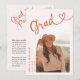 Célébrez un jalon qui mérite d'être rappelé avec cette carte d'annonce de remise de diplôme personnalisée, conçue pour être à la fois intemporelle et sincère. Le devant met en valeur le mot élégant "Diplômé" dans un script fantaisiste fluide, terminé par un élégant cœur qui ajoute de la chaleur et du charme. Centrée en dessous, la photo de votre diplômé est magnifiquement encadrée dans une silhouette d'arc doux, créant un point focal raffiné qui se sent moderne mais classique. Complétez l'apparence avec des détails personnalisés, notamment le nom du diplômé, l'année de promotion et l'école, disposés de manière réfléchie pour une présentation propre et équilibrée.