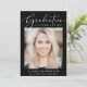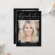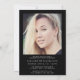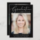 Faire-part de graduation noire d'une fille élégante et invitation à la grande fête avec "Graduation Celebration" en écriture et typographie blanche moderne, sa photo et son nom, l'école et l'année de classe en simple typographie blanche. Au verso, ajoutez une autre photo et les détails de la fête de remise des diplômes.