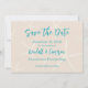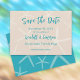 Starfish enregistrer la date des annonces mariages. L'arrière - plan beige est recouvert d'étoiles de mer blanche sur papier horizontal de 5 x 7 pouces qui offre de nombreuses améliorations. Les modèles textuels sont de couleur bleu-vert lagon. Les noms utilisés peuvent être d'abord, ou complets, s'ils correspondent. Reverse est également couvert d'images d'étoiles de mer sur bleu tropical.