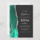 Le bord gauche de cette élégante invitation moderne à la fête du 50e anniversaire comporte une bordure en aquarelle verte de mer ornée de faux parties scintillant argent. Le texte personnalisable combine écriture gris argenté, copperplate et polices italiques sur un arrière - plan noir ardoise. Ajoutez les instructions RSVP au verso de la carte, ainsi qu'un code QR que vous pouvez analyser pour répondre en ligne.