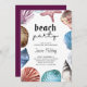Invitation de Graduation Beach Party, encadrée de coquillages d'aquarelle et de créatures océaniques. "beach party" est écrit à la main et le texte restant est entièrement modifiable.