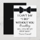 Vous envisagez de demander à quelqu'un d'être votre témoin pour votre futur mariage, alors pourquoi ne pas choisir ces cartes classiques de témoin avec noeud papillon noir. Cette invitation personnalisée fera que votre ami, frère, cousin, neveu, fils ou qui que vous choisissiez se sentira encore plus spécial. Cette invitation est facilement personnalisable en cliquant sur le bouton 'personnaliser' sous l'image où vous pourrez modifier le texte, la police et la taille.