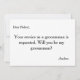 Ce 5" x 7" beau temps à votre service est demandé comme la meilleure carte d'invitation de l'homme Groomsman. C'est mieux pour le marié. Vous avez trouvé votre femme, mais vous avez toujours besoin de vos garçons. Envoyez-leur cette carte de groomsmen. Si vous cherchez à demander à quelqu'un d'être votre toiletteur pour votre futur mariage, alors pourquoi ne pas choisir ces cartes de toiletteur. Cette carte d'invitation customisée fera de votre ami, frère, cousin, neveu, fils ou qui que ce soit d'autre que vous choisissez sentir cet extra spécial. Cette invitation est facilement personnalisée en cliquant sur le bouton customiser sous l'image où vous pourrez changer le texte, la police et la taille. Vous pouvez invitation vos meilleurs copains avec style avec ces invitations classe. Il convient au Best Man ou aux Groomsmen. Envoyez-leur cette carte de groomsmen.