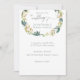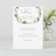 Des feuilles rustiques d'aquarelle vert et or courent des invitations de mariage avec des fleurs blanches avec un texte calligraphique élégant mélangé avec une police moderne. Le modèle est facile à personnaliser avec vos propres informations. Le dos de la carte est foncé, vert, qui correspond aux feuilles de la couronne.