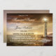Invitation à un service funèbre ou mémorial présentant une scène côtière avec le symbole éternel de l'espoir : un phare. Le coucher de soleil sur l'océan peut également être vu comme symbolique, représentant la fin d'une vie (espérons longue et heureuse). Les lumières guident le chemin vers l'au-delà. De plus, si la personne décédée était un amoureux de l'océan ou a demandé que ses cendres soient dispersées en mer, c'est un excellent moyen de se rassembler et de faire ses adieux.