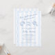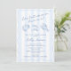 A modern and stylish blue and white Seafood bridal shower invitation for a bride who wants a coastal vibe but with a nod to trends (hand-drawn elements and stripes). This design features a modern wavy border and a hand-drawn sea shell. All colors (stripes, wavy line border, icons, and of course font colors) can be edited by you from inside the design tool.