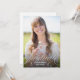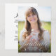 Cette élégante carte de graduation présente une jolie calligraphie argentée et une grande photo. Le faux script en feuille d'argent en lettres sur le bas indique "Graduate" en lettres minuscules décorées d'élégants fleuris. Ajoutez le nom du diplômé et son année de diplôme à l'avant-plan sous la conception de la typographie. Le verso de la carte de graduation comprend un modèle pour ajouter les détails de la fête de graduation.