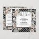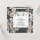 Un beau cadre carré est bordé de délicats roses d'aquarelle dans des tons de blanc pâle et de rose poussiéreux qui forment une bordure autour de modèles noirs et de faux paillettes de parties scintillant scintillantes ; ballons et brins de bijoux posés sur une balance de sirène noir et blanc arrière - plan. Les coins ont des tourbillons délicats en faux argent fleuris et une couronne / tiara en faux argent avec des incrustations de pierres de diamant apparaît le long du bord supérieur. De délicieux feuilles de fougères apportent une douceur à cet élégant et chic style français chic et chic. Idéal pour une douche nuptiale ; fête d'anniversaire ou fête spéciale mariage anniversaire.