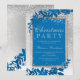 Une typographie argentée moderne, chic et élégante Aquarelle verte florale Invitation de Noël avec feuillage de feuilles d'aquarelle bleu peint à la main sur un dégradé argenté gris chic avec neige blanche et flocons de neige et bleu royal.