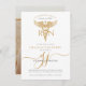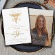 Célébrez votre réussite avec style grâce à cette invitation moderne d'infirmière graduation, avec un design élégant avec un caducée en or, et élégant script calligraphie initiales monogramme. Le design épuré apporte une touche de sophistication. Or et noir. Disponible en version imprimée, en téléchargement numérique ou les deux.