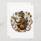 Un singe d'inspiration steampunk habillé d'une tenue mécanique complexe. Le singe porte des lunettes, un gilet et un petit chapeau, tout en tenant un dispositif mécanique complexe ressemblant à un pistolet à rayons. Il est entouré de engrenages, de tuyaux et d'autres éléments industriels, créant une esthétique vapeur riche et détaillée. Les tons dorés des pièces mécaniques contrastent avec la fourrure naturelle, mélangeant des thèmes organiques et mécaniques.