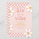 Six est une ambiance Groovy Girl Invitation d'anniversaire de 6 ans inspirée des années 70 avec des polices, des marguerites et un motif à carreaux.