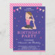 Éblouissez vos invités avec cette invitation de fête d'anniversaire mignonne avec une adorable petite fille faisant du yoga contre un arrière - plan périwinkle. Ajoutez simplement les détails de votre événement sur ce modèle facile à utiliser pour en faire une invitation unique. Retournez la carte pour révéler un motif rayé rose et blanc au dos de la carte.
