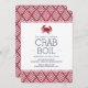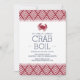 Notre invitation estivale à la bouillie de crabe est parfaite pour votre fête estivale de fruits de mer! Le design comprend un arrière - plan motif de chevron en diamant rouge et blanc et une illustration de crabe rouge, avec les détails de votre événement en lettres bleu marine. "Bouillir" peut être customisé pour convenir à votre type de fête : fête du crabe, alimentation, fête ou ébullition !