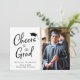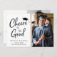 Moderne deux faire-part de remise de diplômes photo et invitation à la fête. Sur le devant, la photo de votre diplômé est à côté de "Cheers to the Grad" écrit dans un script moderne avec un grand casquette sur le dessus. Personnalisez facilement avec son nom, son année de classe et son école. Au contraire, ajoutez les détails de la fête de remise de diplômes ou de la maison ouverte et une deuxième photo.