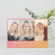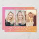 Invitation à la fête de remise des diplômes tendance avec un arrière - plan dégradé rose à orange, trois photos de la grade, "diplômée" dans un script blanc chic et son nom et année de classe dans une simple typographie blanche moderne. Ajoutez les détails de votre fête à l'arrière.
