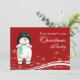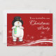 Drôle dessin animé Frosty the Snowman sur un arrière - plan rouge enneigé. Très mignonne et amusante invitation à la fête de Noël.