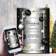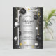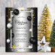 Invitation tes amis et ta famille à ta fête de Noël cette année avec cette invitation moderne qui présente une bordure blanche ornée de billes de sapin noir et blanc devant un arrière - plan noir et argent.