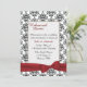 Élégante invitation à dîner de répétition de mariage faite en damas noir et blanc, avec une zone de texte encadrée, au milieu. Graphiques d'un joli ruban rouge et d'un arc, décorent le fond de l'invitation. Le texte en noir et rouge foncé est prêt à être personnalisé pour votre événement.