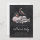 Une éffrayante invitation à la fête d'Halloween, avec crâne, os, fleurs gothiques et corbeau assis sur un citrouille blanc, sur un arrière - plan noir fumé. Personnalisez cette invitation unique et élégante de fête d'Halloween avec vos détails d'événement sous.