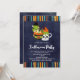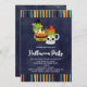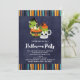 Invitation de fête d'Halloween avec un cupcake d'Halloween avec un gros globe oculaire. Un coquelicot vert en forme de monstre de Frankenstein. Une tasse avec un visage crânien rempli de friandises et de bouc vert gouttant.
