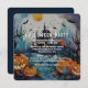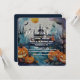 Invitation à la fête d’Halloween avec une aquarelle illustrant des fioles de valet éffrayant, des chauves-souris et un manoir hanté.