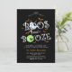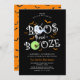 Boos & Booze L'invitation pour la fête des adultes d'Halloween présente un arrière - plan noir avec des chauves-souris volantes orange, un fantôme bleu irisé volant à travers des "boos", une tasse de booze vert étincelant avec un globe oculaire rouge et de la paille. Dos : arrière - plan orange sur le avec chauves-souris volantes noires surligné en blanc.
