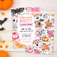 Ce design Halloween Party & Trick ou Treating présente de mignons fantômes et de adorables chauves-souris aux citrouilles et aux fleurs roses et oranges. Idéal pour la fête d'halloween d'une petite fille. Vous pouvez customiser tout le texte de votre événement. Au dos de l'invitation se trouve un mignon motif avec des fantômes, des chauves-souris, des citrouilles et des fleurs. Voir l'ensemble de la collection correspondante. Toutes les oeuvres d'art sont illustrées à la main dans un style aquarelle et sont protégées par le droit d'auteur de Kaitlyn Thomas.