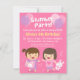 Invitez vos invités à emballer leurs pyjamas, leur oreiller et leur sac de couchage pour une fête d'anniversaire pyjama amusante ! Ça va être une soirée entre filles et un moment amusant ! Le design présente deux filles mignonnes, l'une avec une queue de cheval et tenant un oreiller tandis que l'autre avec une pince à cheveux et un pantalon à pois tient un lapin. Elles dansent joyeusement pour la fête pyjama. Des symboles musicaux, des ballons roses et violets à l'arrière-plan avec le texte "fête pyjama" qui n'est pas modifiable. Personnalisez facilement le reste du texte avec les détails de votre fête. Au verso, il y a un motif d'icône de lapin.