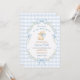 Featuring soft blue gingham checks, a watercolor bunny holding a baby bottle, and a bow-and-floral wreath framing your event details, this design blends classic nursery style with gentle whimsy.