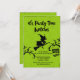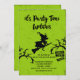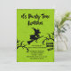 Invitation de la fête d'Halloween avec une sorcière volante parmi les arbres déplaisants sur un arrière - plan vert fluorescent. Une façon amusante d'invitation vos sorcières à votre fête d'Halloween.