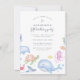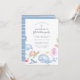 Ce design moderne présente une typographie élégante encadrée par de mignons animaux de l'océan aquarelle. Il y a une méduse, un dauphin, une tortue, un crabe, une raie, une baleine, une pieuvre, un hippocampe, deux poissons et des bulles bleues. L'envers de cette invitation a un arrière - plan bleu marine avec de mignons rayures blanches. Affichez le lien de collection sur cette page pour les produits correspondants.