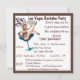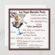 Cartons d'invitation pour enterrement de vie de garçon à Las Vegas avec le panneau de bienvenue et une illustration de danseuse de casino . Facilement personnalisables pour des thèmes de fête de casino dans d'autres lieux également.Le costume amusant de la danseuse, le verre à cocktail et le célèbre panneau de bienvenue de Las Vegas créent un design personnalisé cool pour les fêtes de mariage.