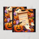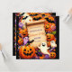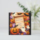 Le design comporte un défilement de parchemin vieilli au centre, offrant un espace vide pour le texte. Autour du parchemin se trouvent diverses icônes sur le thème de l'Halloween, dont des lanternes crêpes souriantes, des fantômes à différentes expressions, du maïs-bonbons, des lollipops de couleur Halloween, des araignées noires et des chauves-souris. L'arrière - plan est un violet profond avec des motifs étoiles subtils, créant une atmosphère ludique et éffrayante parfaite pour une invitation à Halloween.
