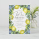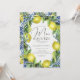 Teintes de citron et indices de fête : un conte d'amour écrit dans un stand de citronnade ou de citronniers arborant un décor de tuiles bleues italiennes. Cette invitation avec le thème "Elle a trouvé son principal pressoir" capture l'essence de ce récit sucré, vous invitant à célébrer la découverte de l'amour de la mariée et un thème lumineux et ensoleillé de la douche nuptiale. Découvrez une douche nuptiale à thème agrumes qui rayonne de chaleur et de zeste. Une aquarelle tendance et moderne illustrant les branches de citrons et de citrons, disposées dans un cadre ovale, offre le décor de cette invitation à bruncher sur le thème de l'agrumes, élégante et chic, qui comprend également une aquarelle de peinture italienne. Une calligraphie élégante complète ce design unique qui est parfait pour une douche nuptiale de printemps ou d'été, pour une fête de jardin, une fête festive à l'intérieur ou une fête de maison sobre.
