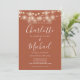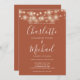 Élégant faire-part de mariage signature en terre cuite avec de jolies lampes à cordes et des noms de style signature, ce faire-part de mariage élégant peut être personnalisé avec vos informations en lettrage blanc chic. Conçu par Thisisnotme©