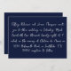 Les détails du mariage sont listés dans un style manuscrit, texte blanc. Le dos de l'invitation est un bleu marine solide avec le texte blanc pour la date.
