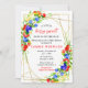This fun and whimsical baby shower invitation features watercolor blueberries, strawberries, redberries and foliage on a gold geometric frame. The text combines handwritten script and serif fonts for a stylish and modern look. This is perfect for a summer rustic baby shower.