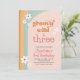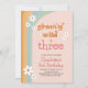 L'invitation pour la fête d'anniversaire de cette fille présente un design amusant des années 70 avec le texte "super sauvage et trois". Le design est accentué par des couleurs boho, des marguerites blanches et une police de style rétro. L'âge peut être modifié pour n'importe quel enfant d'âge.