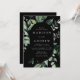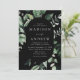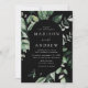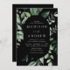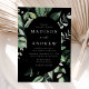 Invitations de mariage élégantes avec vos détails mariages nichés dans un cadre ovale entouré d'eucalyptus, fougères et autres riches verdure avec un arrière - plan noir. Les invitations de mariage botanique modernes s'inversent à un arrière - plan noir solide. Conçu pour coordonner avec notre collection de mariages de verdure Abondante.